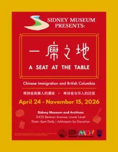 The Sidney Museum and Archives is excited to announce the opening of its 2026 featured exhibit, A Seat at the Table: Chinese Immigration and British Columbia. Developed by the Chinese Canadian Museum in partnership with the Museum of Vancouver and the University of British Columbia, this exhibit will be on display from April 24-November 15, 2026.