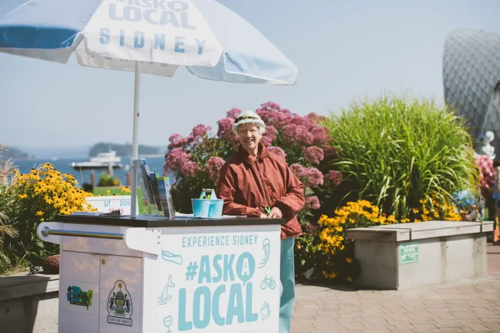 In the summer months, services expand to include the “Ask a Local” kiosk along Sidney’s waterfront. Positioned in one of the busiest visitor areas, this kiosk creates a more informal and immediate opportunity to engage with visitors as they move through the community.